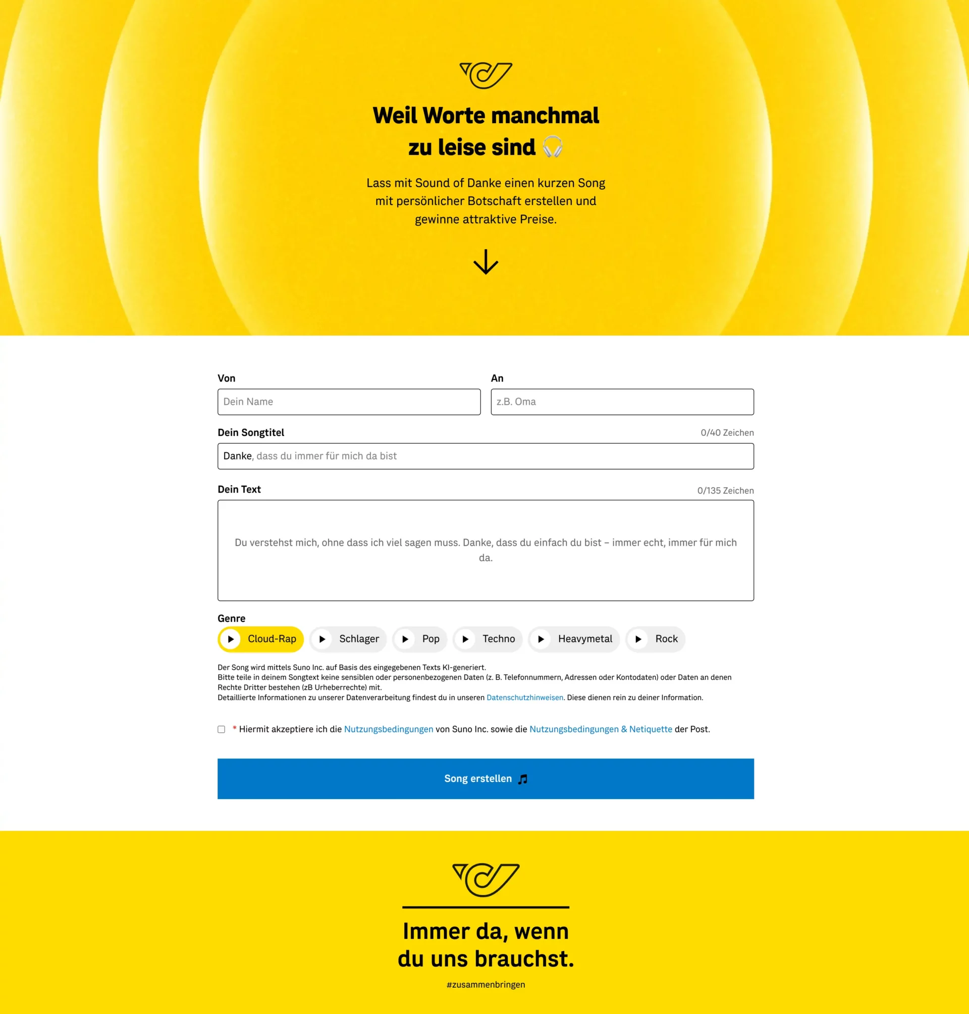 Die Leitidee war ebenso einfach wie stark: „Sound of Danke“ – personalisierte Musikgrüße aus einer kurzen Nachricht. Aus einer individuellen Botschaft, der Auswahl eines Musikgenres und der Angabe der adressierten Person entstand in Sekunden ein eigener Danke-Song: ein moderner, emotionaler Gruß, der sich anhören und teilen lässt. „Danke“ wurde wortwörtlich hörbar – und die Post übernahm dabei die Rolle der Ermöglicherin: Sie ließ Menschen miteinander sprechen, statt nur über Kommunikation zu reden.