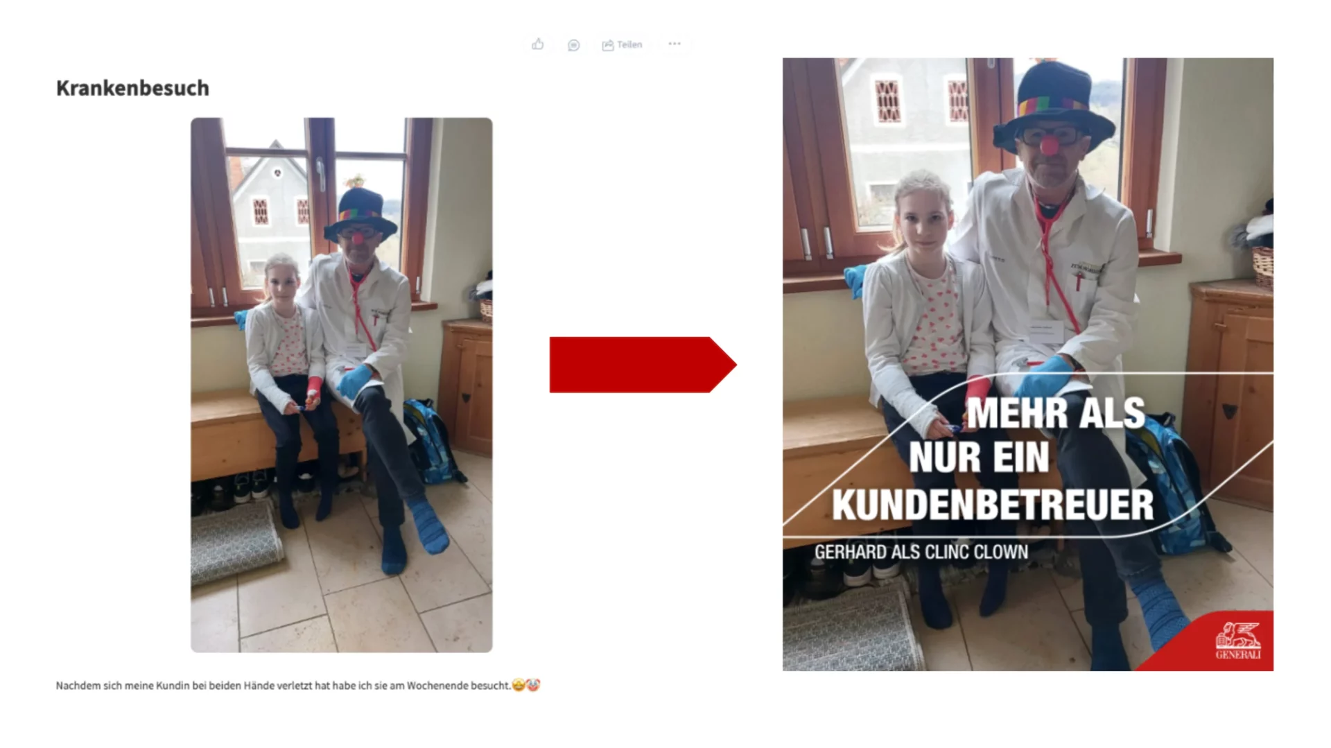 Für das Story Scouting nutzen wir Sociabble als zentrale Plattform. Mithilfe des Tools sammeln und sichten wir sämtliche Online-Beitrage der Mitarbeiter*innen und wählen die besten davon aus, um diese auf den Corporate Accounts von Generali als Kampagnen zu veröffentlichen. So werden Highlights möglich wie etwa das private Facebook-Posting eines Kundenbetreuers beim Besuch einer kleinen Patientin, aus dem eine Generali-geförderte Spendenkampagne für die Klinik-Clowns entstand:
