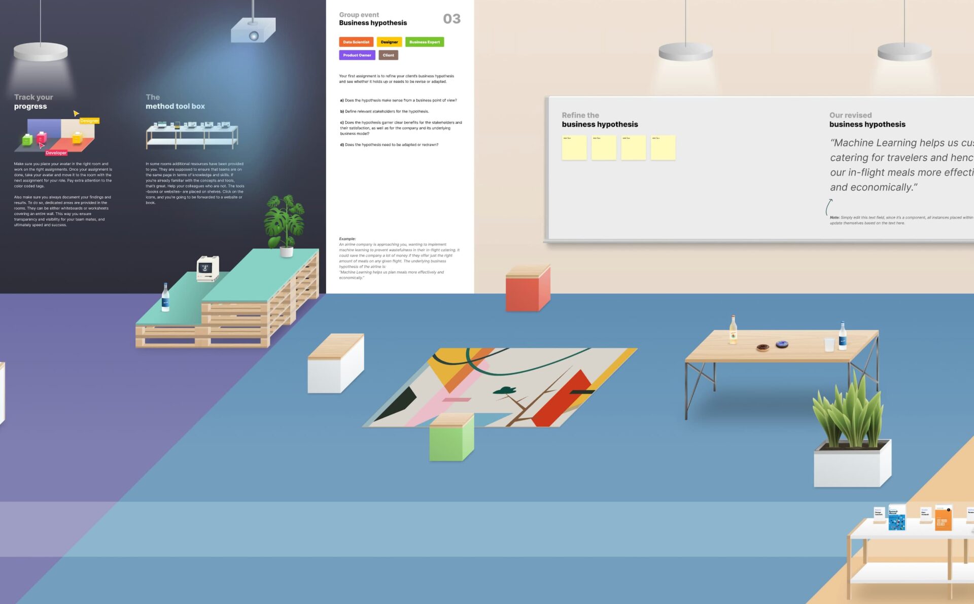 Floom is divided into rooms, each with specific tasks that need to be completed based on roles (see figure 1). Designers receive assistance through worksheets to create an intelligence experience, develop an MVP, and test prototypes. They also get support in understanding AI processes and the confusion matrix.