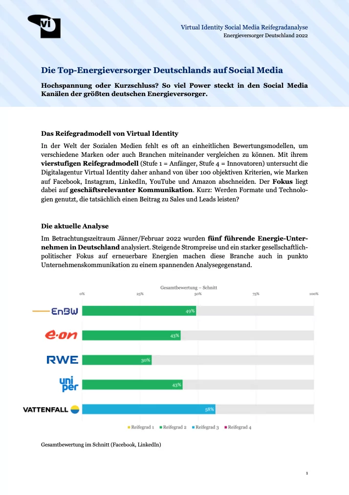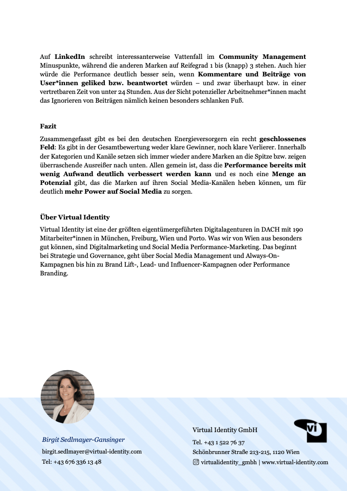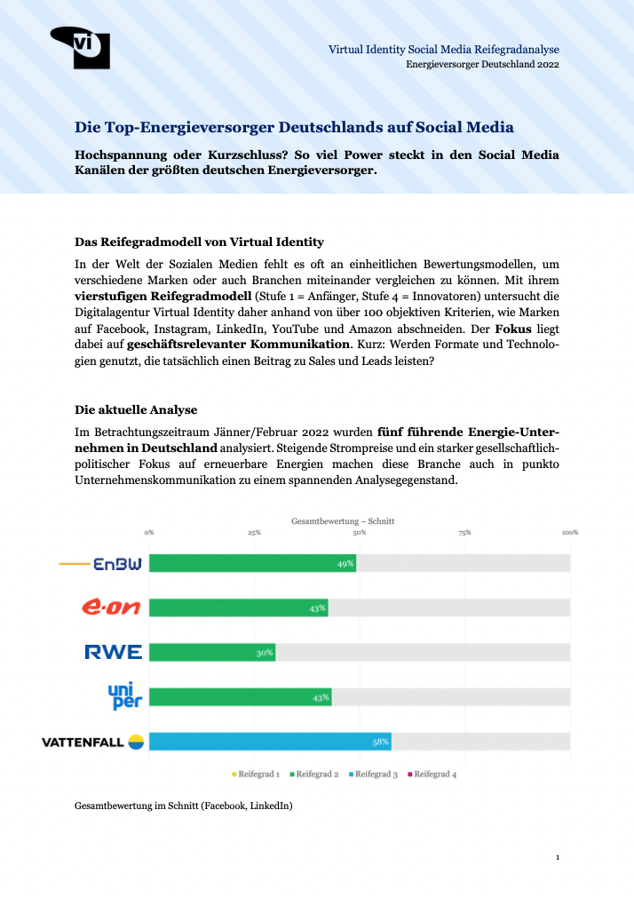 Zusammengefasst gibt es bei den deutschen Energieversorgern ein recht geschlossenes Feld: Es gibt in der Gesamtbewertung weder klare Gewinner, noch klare Verlierer. Innerhalb der Kategorien und Kanäle setzen sich immer wieder andere Marken an die Spitze bzw. zeigen überraschende Ausreißer nach unten. Allen gemein ist, dass die Performance bereits mit wenig Aufwand deutlich verbessert werden kann und es noch eine Menge an Potenzial gibt, das die Marken auf ihren Social Media-Kanälen heben können, um für deutlich mehr Power auf Social Media zu sorgen.