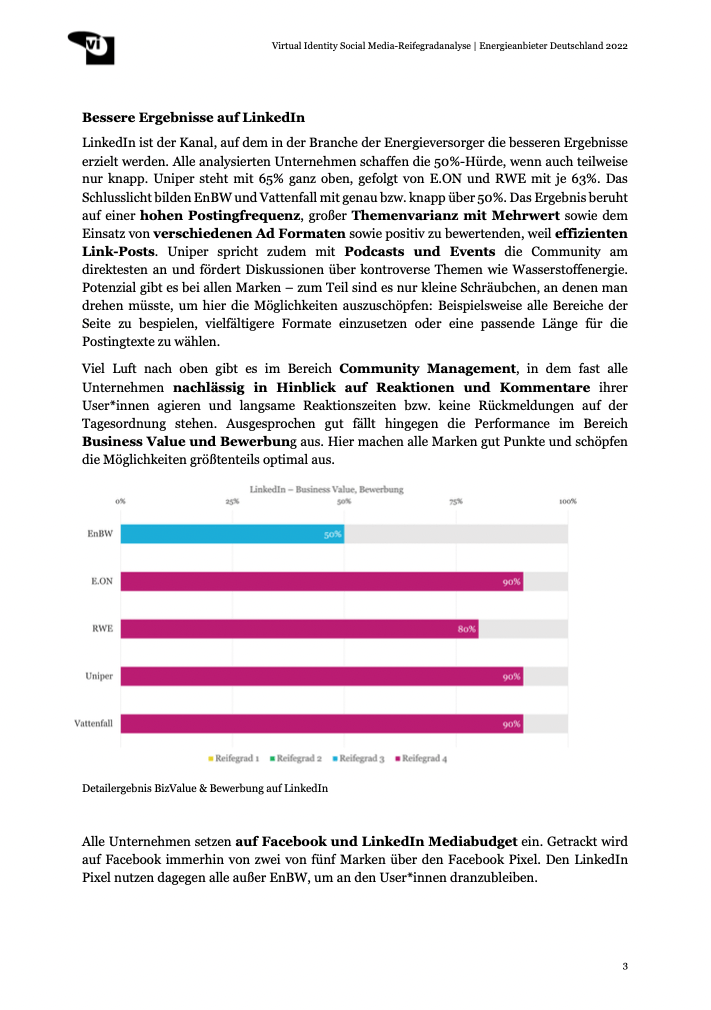 Viel Luft nach oben gibt es im Bereich Community Management, in dem fast alle Unternehmen nachlässig in Hinblick auf Reaktionen und Kommentare ihrer User*innen agieren und langsame Reaktionszeiten bzw. keine Rückmeldungen auf der Tagesordnung stehen. Ausgesprochen gut fällt hingegen die Performance im Bereich Business Value und Bewerbung aus. Hier machen alle Marken gut Punkte und schöpfen die Möglichkeiten größtenteils optimal aus. Alle Unternehmen setzen auf Facebook und LinkedIn Mediabudget ein. Getrackt wird auf Facebook immerhin von zwei von fünf Marken über den Facebook Pixel. Den LinkedIn Pixel nutzen dagegen alle außer EnBW, um an den User*innen dranzubleiben.